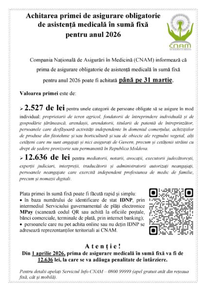 Compania Națională de Asigurări în Medicină (CNAM) informează că
