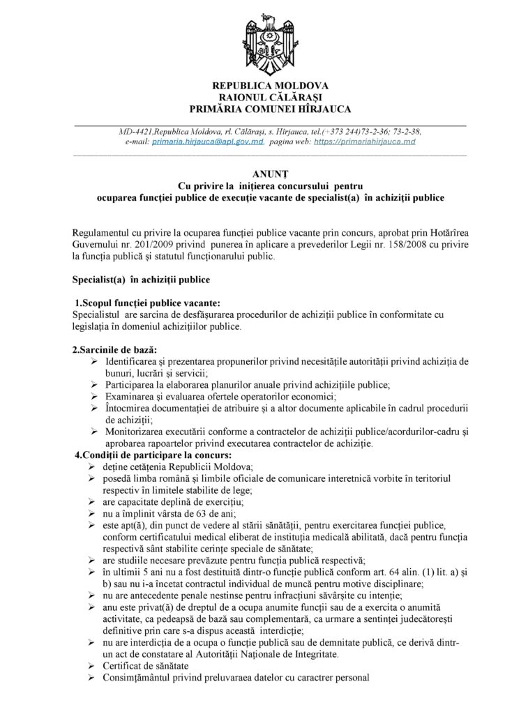 ANUNȚ Cu privire la inițierea concursului pentru ocuparea funcției publice de execuție vacante de specialist(ă) în achiziții publice
