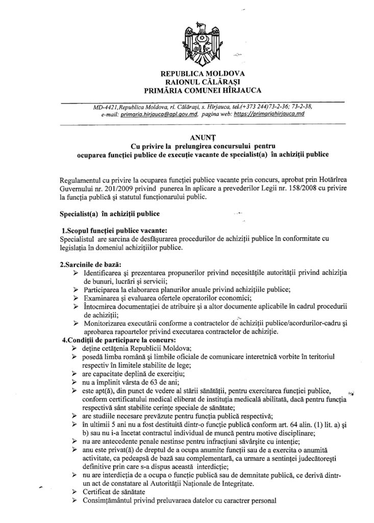 ANUNȚ Cu privire la prelungirea concursului pentru ocuparea funcției publice de execuție vacante de specialist(a) în achiziții publice