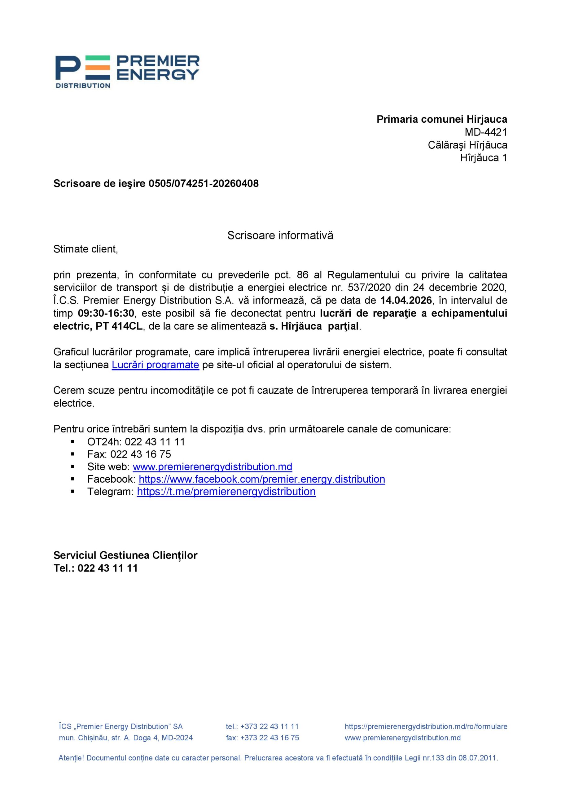 Stimați locuitori ai comunei Hîrjauca! Administrația Primărieicomunei Hîrjauca vă informează că joi 30 aprilie 2026, ora […]
